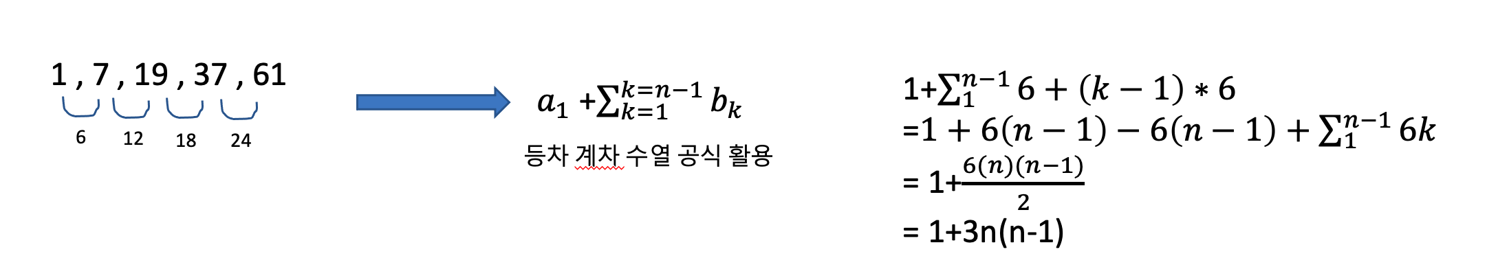 이 형태가 나오는 것을 보고서 등차계차수열임을 알게 되었습니다. 하지만.. 고등학교 교육과정을 잊은지 오래 되었기 때문에 풀기 위해서는 다시 공식을 참고하면서 수식을 도출해내야 했습니다.