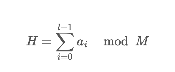 해시 값을 계산하기 위해서 우리는 문자열 혹은 수열을 하나의 정수로 치환하려고 한다. 간단하게는 수열의 값을 모두 더할 수도 있다. 해시 함수의 정의에서 유한한 범위의 출력을 가져야 한다고 했으니까 적당히 큰 수 M으로 나눠주자. 짜잔! 해시 함수가 완성되었다. 이를 수식으로 표현하면 아래와 같다.