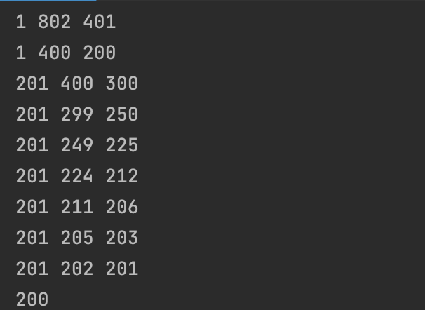 계속 해당하는 범위를 찾게 되며 마지막에 mid값이 201일때 end를 mid - 1을 하게되어 200이 최대 값으로 출력됩니다.