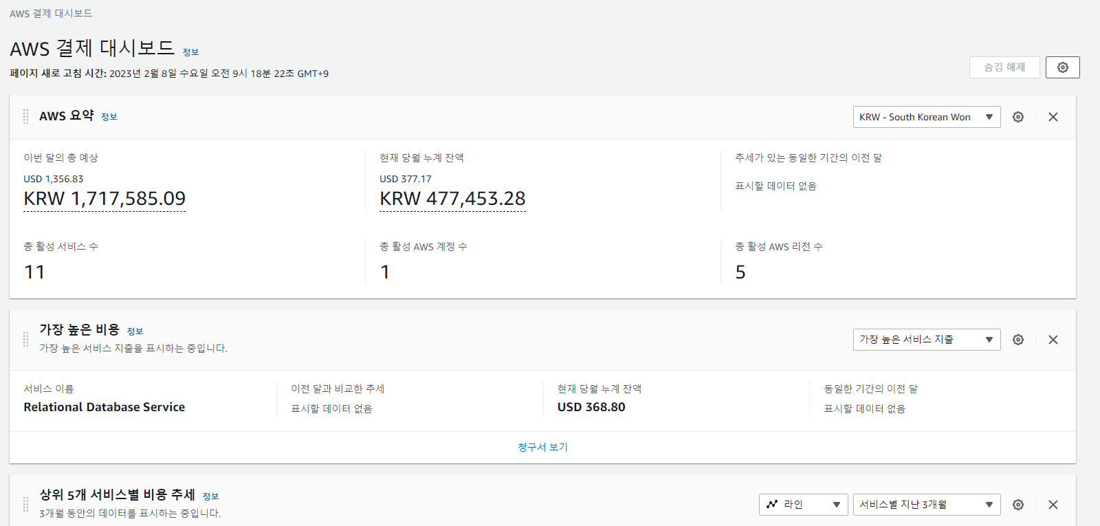 와... 예전에 다른 사람들이 AWS 과금 폭탄 맞았다는 말을 들었지만 그 당시에 그냥 그러려니 했었는데 이게 내 얘기가 되니까 체감이 너무 달랐다. 불난 집 보러 갔는데 불난 집이 우리집이었다는 유머처럼 이 순간 정말 당황했다. 특히 나는 RDS를 EC2에 연동하려고 붙이는 것만 해보려고 시도만 했을 뿐 사실 아무것도 한게 없는데 RDS에서 368달러나 과금이 된 것에 이해 할 수 없었다.