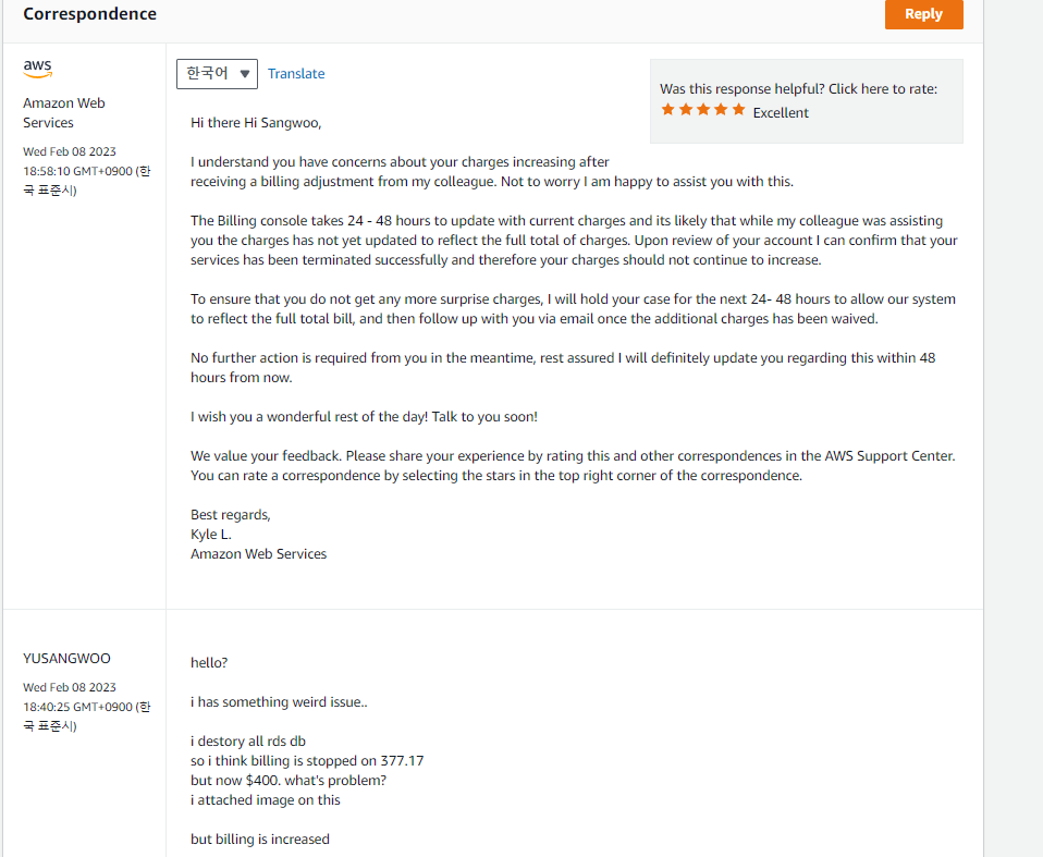 그래서 이제 나의 싹싹 빌기 위해 허접한 나의 영어 실력이지만 AWS CS팀에 요청을 넣었다.