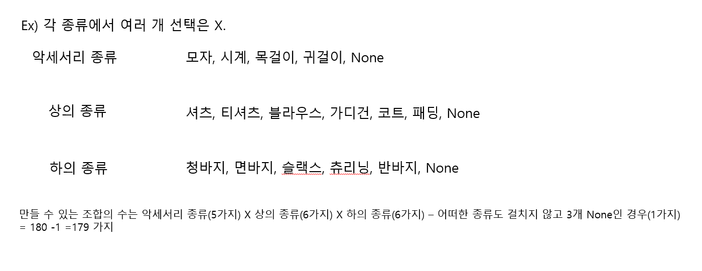 보이는 것과 같이 걸치지 않는 것도 하나의 경우로 생각하고서 조합을 계산하되, 모두 걸치지 않는 경우는 존재하지 않는다는 문제의 조건을 고려해서 모든 종류에서 None일때인 경우의 수 1개를 빼준 것이 문제의 답이 됩니다.